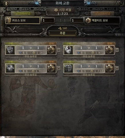 - 평균 시세가 카오스 160개 ≈ 엑잘티드 1개 라는 식으로 직관적으로 표시