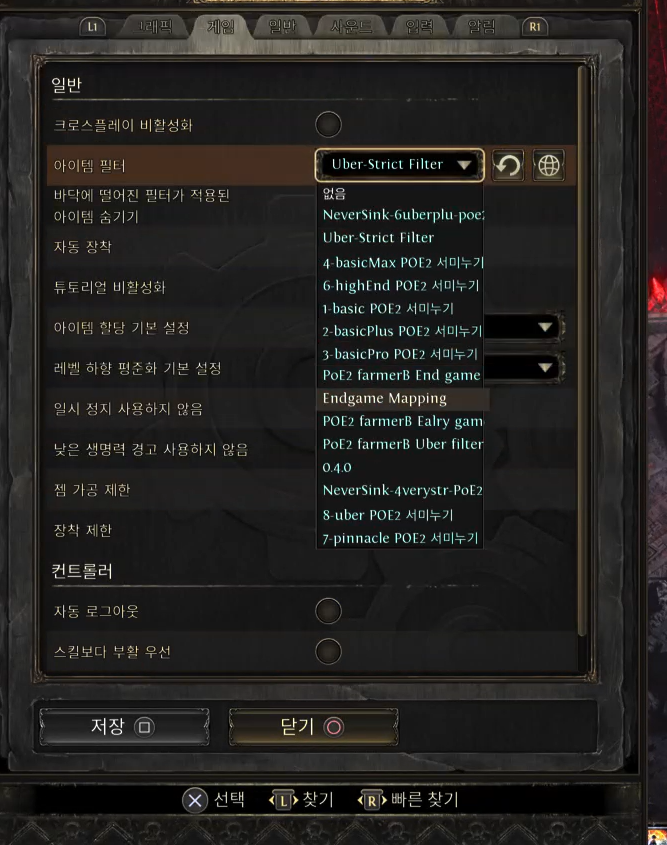 게임으로 돌아가서 설정에서 게임으로 들어가면 아이템 필터 설정이 가능합니다.