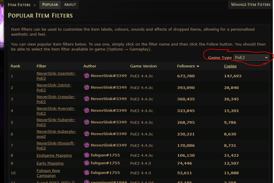 poe2 홈피 들어가면 GAME -> Item Flters 로 들어갑니다.