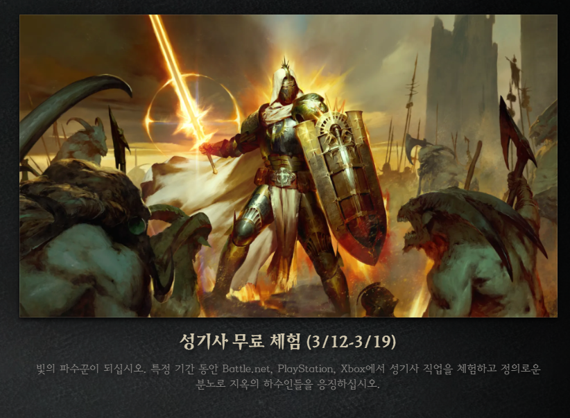 확장팩 전용 클래스인 성기사를 3월 11일부터 18일까지 무료로 플레이할 수 있습니다! 최대 25레벨까지 키워볼 수 있으며, 나중에 확장팩을 구매하면 진행도가 그대로 유지된다고 하니 꼭 찍먹해 보세요.